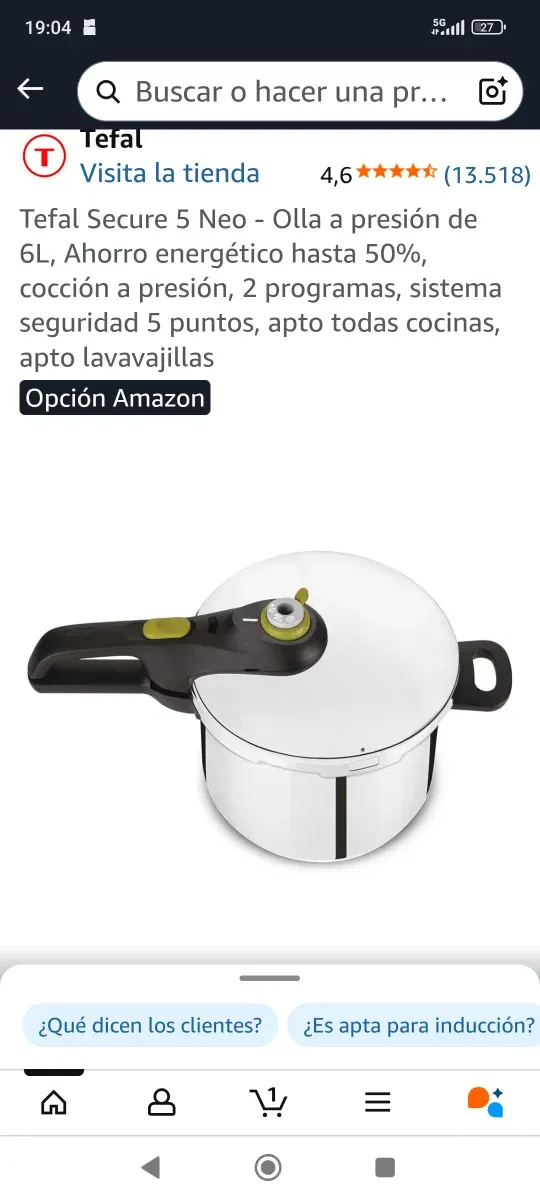Detalles del productoOlla a presión Tefal Secure 5 Neo de 6 litros. Diseñada para un ahorro energético de hasta el 50%.