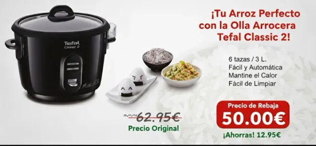 Olla arrocera Tefal Classic 2, ideal para preparar arroz. - Capacidad de 6 tazas / 3 L. - Fácil y automática. - Mantiene el calor. - Fácil de limpiar.