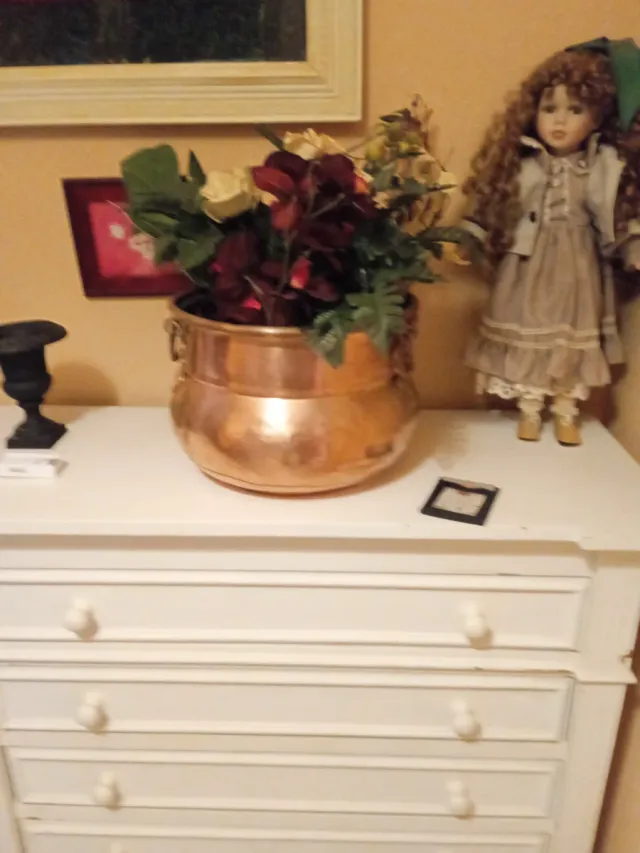Preciosa olla decorativa de cobre, ideal para añadir un toque rústico a tu hogar. Su diseño y material la hacen destacar. - Material: Cobre - Color: Dorado cobrizo