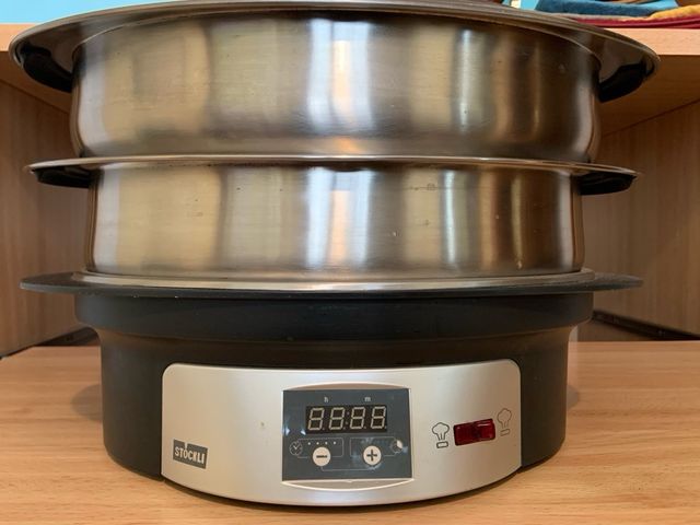 Detalles del productoOlla de vapor Stöckli con temporizador que permite programar la puesta en marcha y detener su cocción.