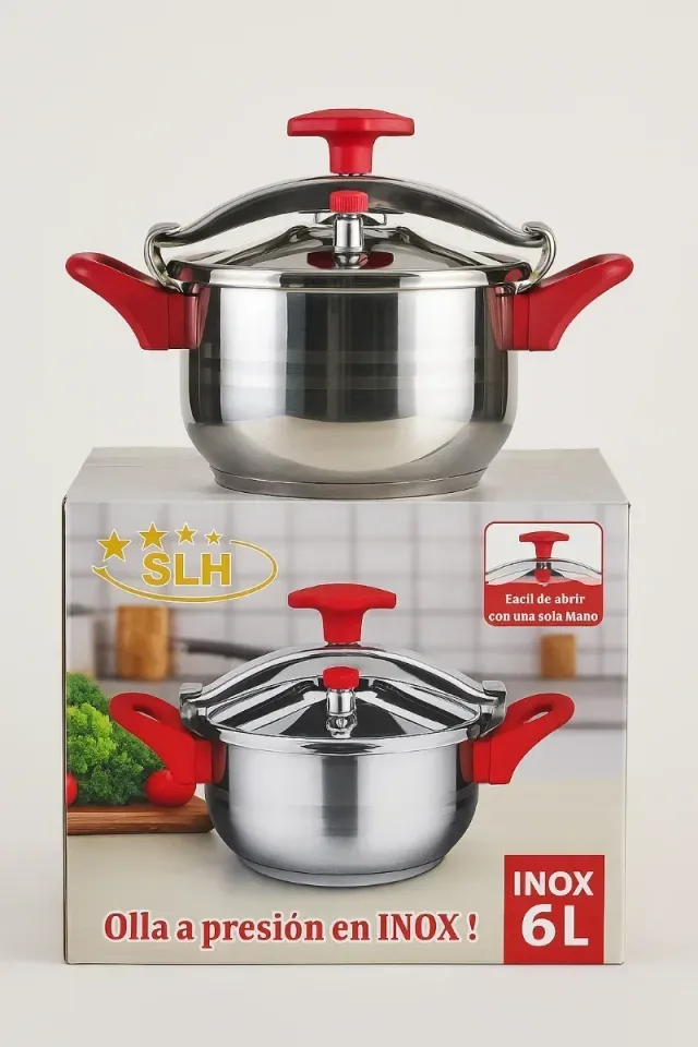 Olla a presión de acero inoxidable con una capacidad de 6 litros. Cuenta con asas rojas y un diseño moderno.