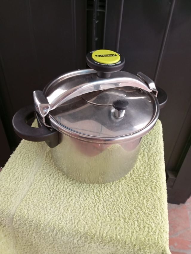 Olla a presión de acero inoxidable, marca Monix. - Dos asas laterales - Cierre de seguridad Se ha usado 3 o 4 veces. Muy poco uso.