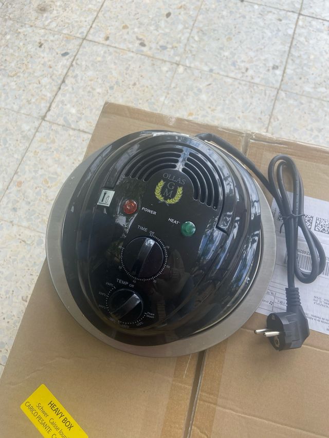 Detalles del productoOlla freidora de aire de la marca GM, prácticamente nueva. Es de color negro y tiene un diseño elegante.