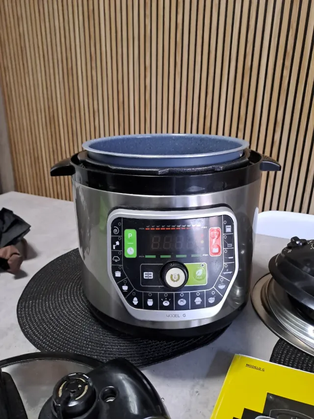 Olla programable GM modelo G. - Panel de control digital. - Programas preestablecidos. - Cubeta antiadherente. Con cabezal de horno incluido
