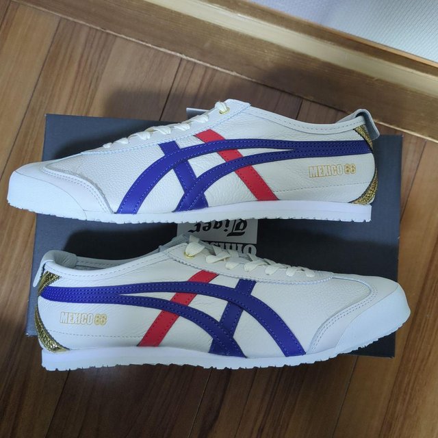Zapatillas Onitsuka Tiger blancas con detalles en rojo y azul.