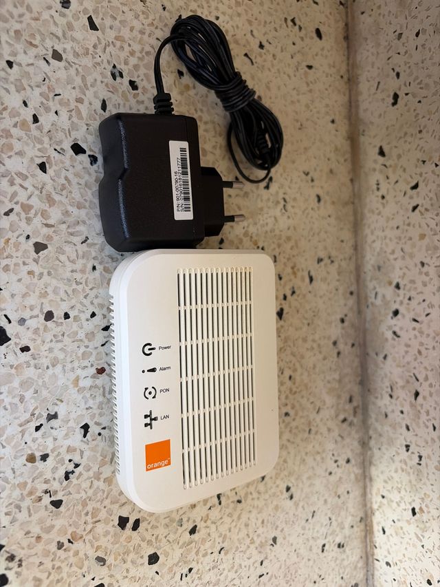 Dispositivo ONT de Orange, modelo G-010G-P. - Indicadores LED para Power, Alarm, PON y LAN. - Diseño compacto y moderno.