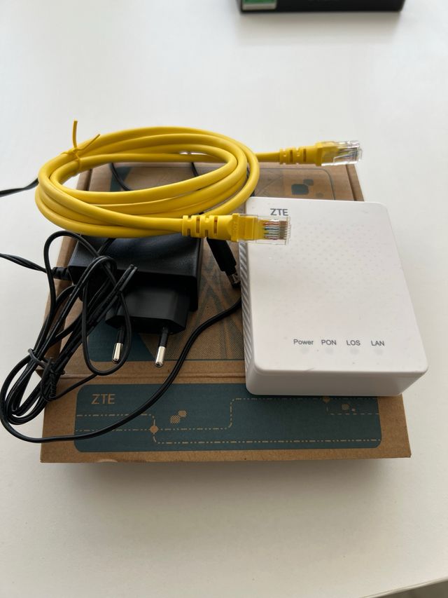 ONT ZTE con cable Ethernet y adaptador