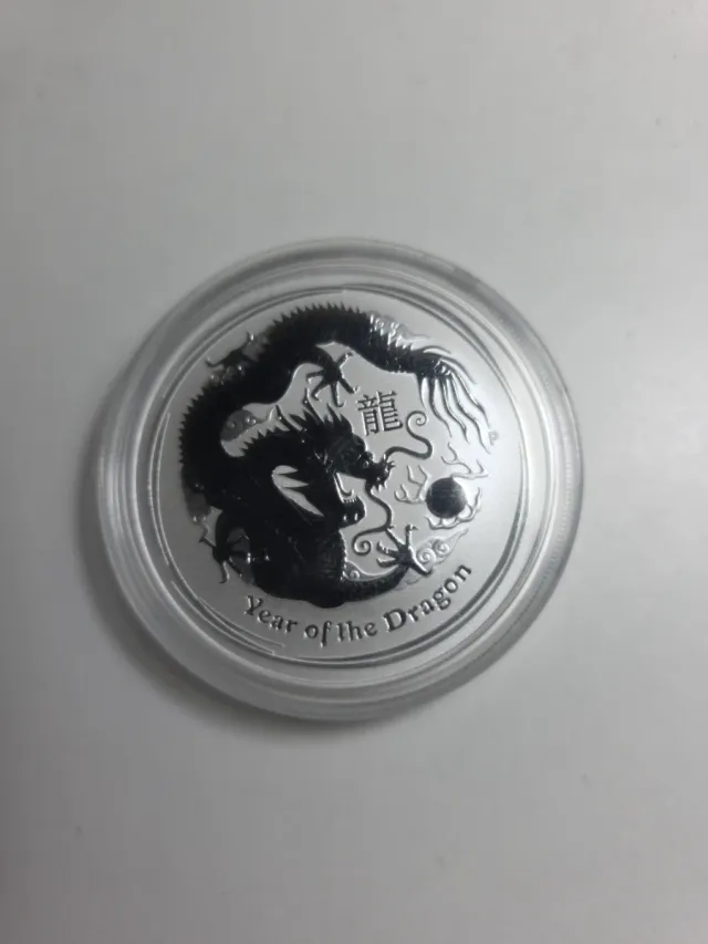 Moneda de plata conmemorativa del Año del Dragón. - Diseño detallado de un dragón. - Inscripción Year of the Dragon en inglés. - Carácter chino 龍 (dragón) visible.