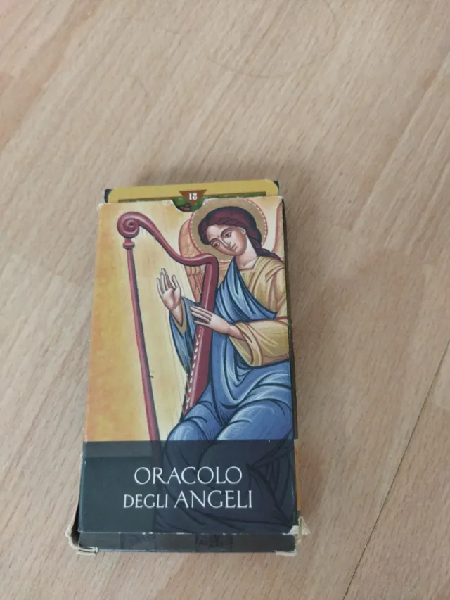 Cartas de oráculo Oracolo degli Angeli. Desgaste solo la caja - Ilustración de un ángel tocando el arpa. - Incluye el número 21 en la parte superior.