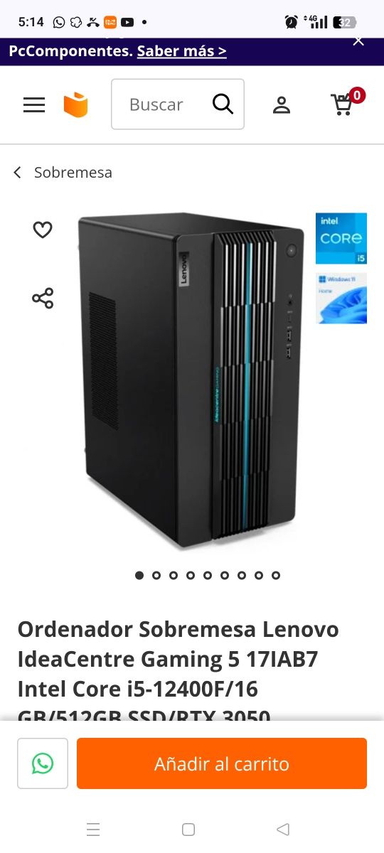 Ordenador de sobremesa Lenovo IdeaCentre Gaming 5. - Procesador Intel Core i5-12400F - 16 GB de RAM - SSD de 512 GB - Tarjeta gráfica RTX 3050