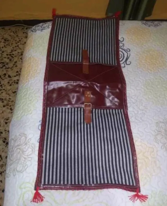 Detalles del productoOrganizador enrollable de tela a rayas con detalles en piel sintética.