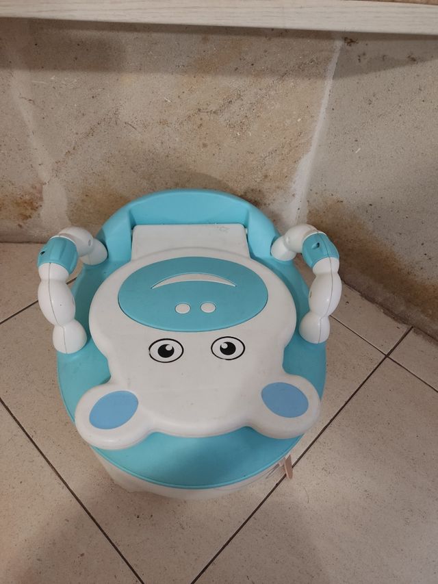 Orinal infantil con diseño divertido de oso. - Color azul y blanco. - Asiento cómodo. - Con asas de seguridad.