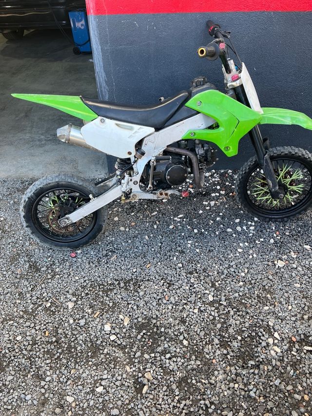 Pit bike Orion 125cc en color verde y blanco. Ideal para iniciarse en el mundo del motocross. SOLO FALTA FRENO DELANTERO COMPLETO Cambiar cubierta trasera .