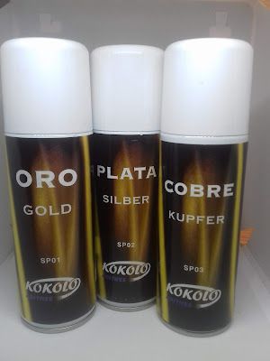 Sprays Oro 200ml. Kokolo Oro, plata y cobre, efectos en las fotos. Precio por bote.