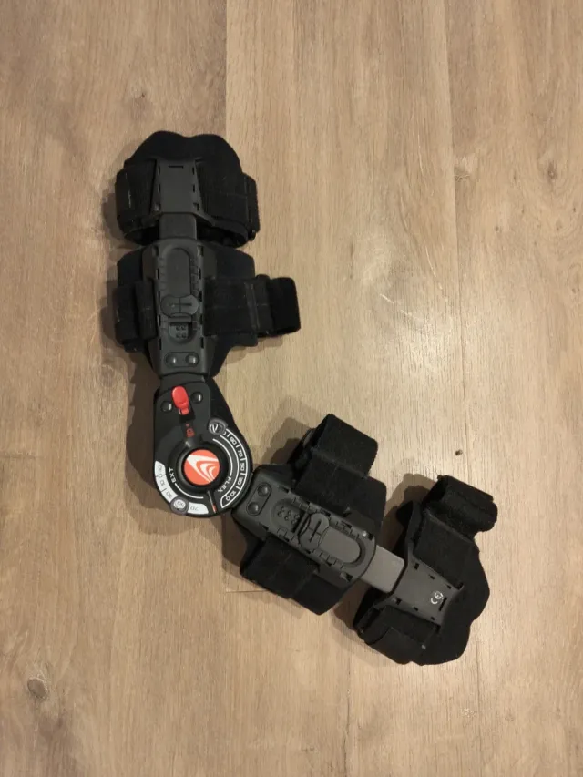 Ortesis de codo Breg con ajuste de flexión y extensión. - Diseño articulado. - Correas de velcro para sujeción. - Dial de ajuste de rango de movimiento.