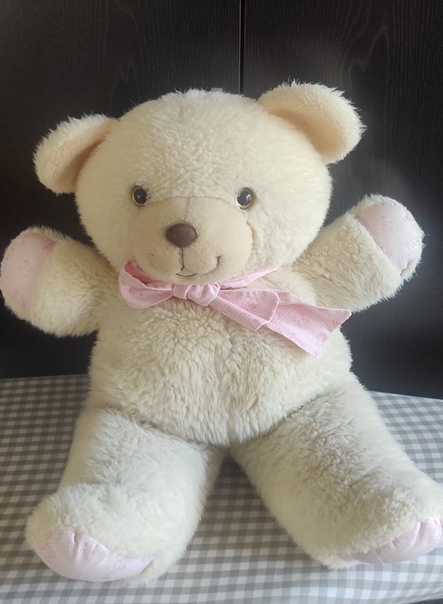 Detalles del productoAdorable osito de peluche de color crema, perfecto para abrazar. Tiene un dulce lazo a cuadros rosa en el cuello y detalles a juego en las patitas.