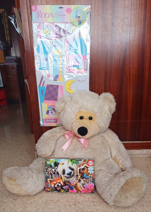 Detalles del productoPack formado por un oso de peluche gigante de color marrón claro con lazo rosa, un puzzle de animales de 300 piezas y una pegatina también gigante para la pared que es un metro. Ésta última es de llamativos colores y está en su forro sin estrenar. El puzzle y el oso sí han sido utilizados pero están en buen estado ambos. El precio es del pack.