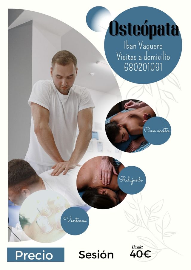 Detalles del productoOsteópata estructural, visceral y craneal (recuperar las disfunciones de movimiento y da elasticidad el tejido) trabajo neuromuscular, drenaje linfático, masaje descontracturante, relajante y deportivo, estiramiento de fascia…