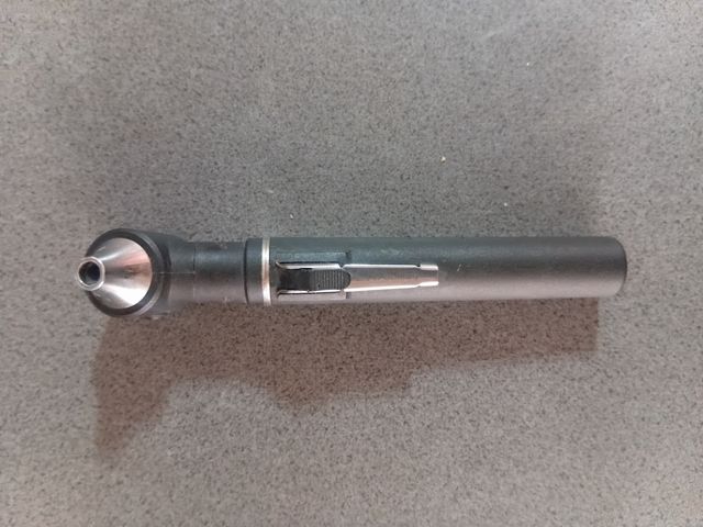 Instrumento médico diseñado para la auscultación del oído. - Mango metálico con clip. - Cabezal cónico plateado.