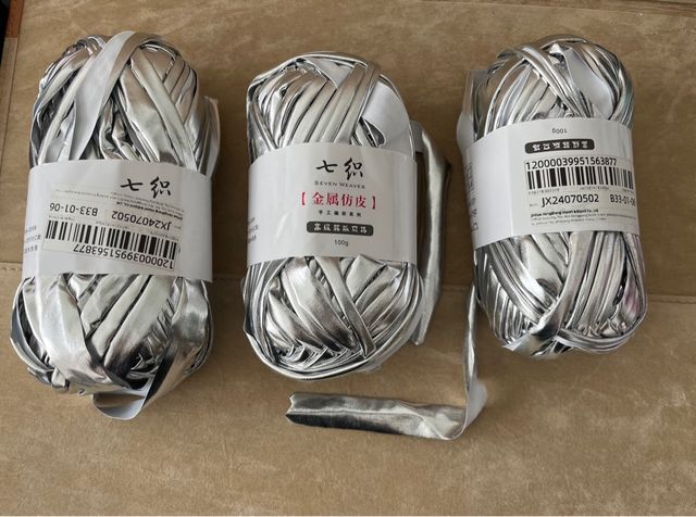 Lote de tres ovillos de trapillo de color plateado. Cada ovillo pesa 100g. Nuevos a estrenar. Ref. 4
