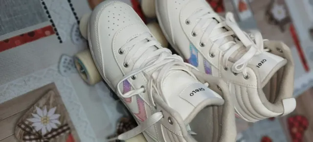 Preciosos patines de 4 ruedas, blancos y hologramas plateados. T36, válido para 35. Con apenas uso y en perfectísimo estado, incluye bolsa original. Tiene incluso las etiquetas interiores.