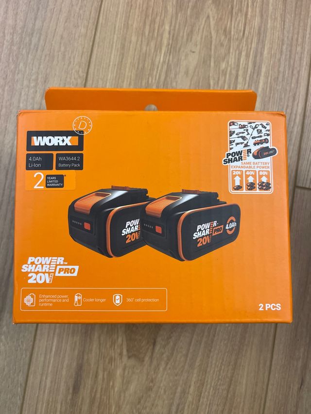 Detalles del productoPack de dos baterías de litio de 20V y 4Ah de la línea Powershare Pro de WORX. Ofrecen mayor rendimiento y durabilidad.