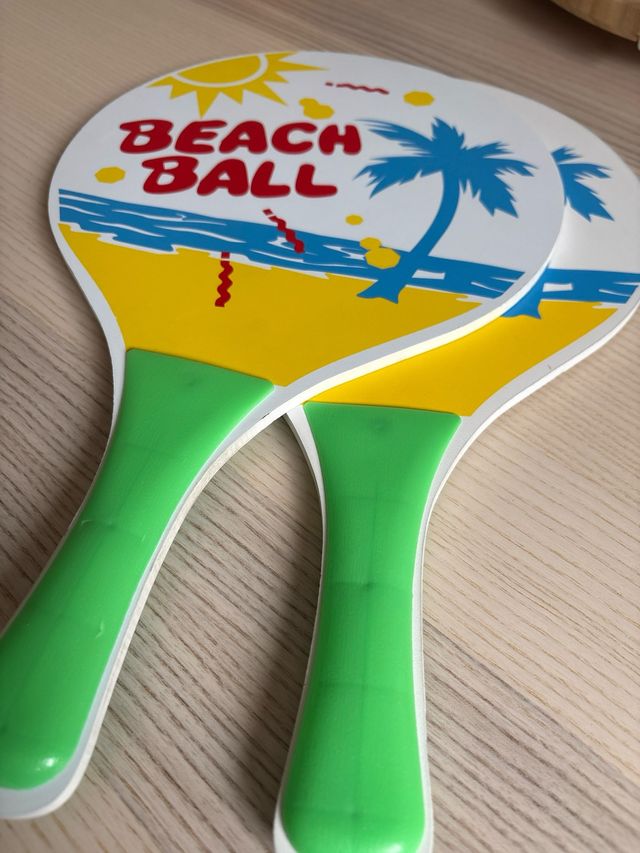 Pack de dos palas de playa con diseño veraniego. - Diseño con palmeras y sol. - Mangos de color verde.