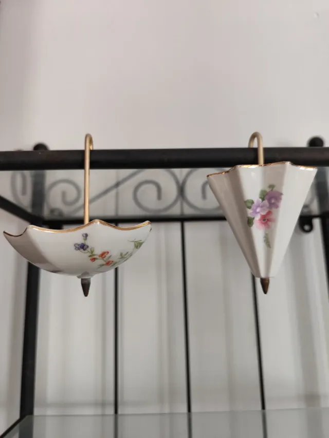 Detalles del productoConjunto de dos paraguas decorativos en miniatura, elaborados en porcelana y con delicados diseños florales. Ambos por 8€.