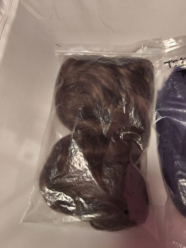 Detalles del productoPack de dos pelucas, una de color marrón y otra morada. Perfectas para disfraces o eventos.