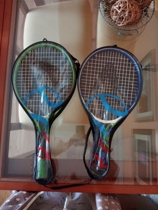 2 raquetas por 10€ Marca boomerang compradas en corte ingles Una más pequeña que otra, Son de niño Azul y verde Habría que ponerle a la verde la tira del mango