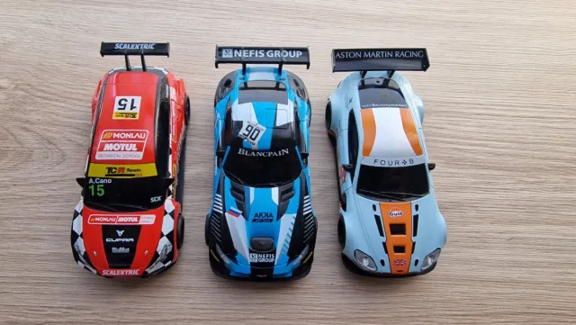 Conjunto de tres coches de Scalextric con diseños variados. - Coche Cupra León. - Coche Mercedes AMG GT3 - Coche Aston Martin Vantage.