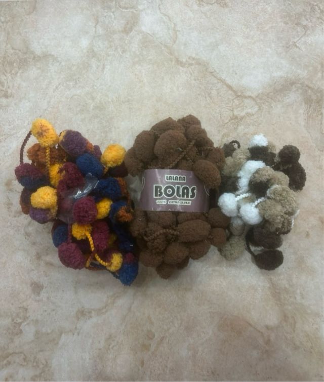 Lote de tres ovillos de lana - Colores variados: marrón, blanco y multicolor. - Material 100% extra suave.