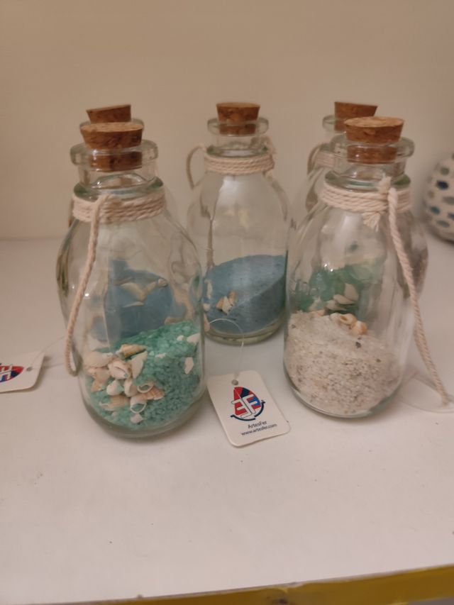 Detalles del productoConjunto de cuatro botellas de cristal decorativas, perfectas para dar un toque playero a tu hogar. Cada botella contiene arena de colores y conchas marinas.
