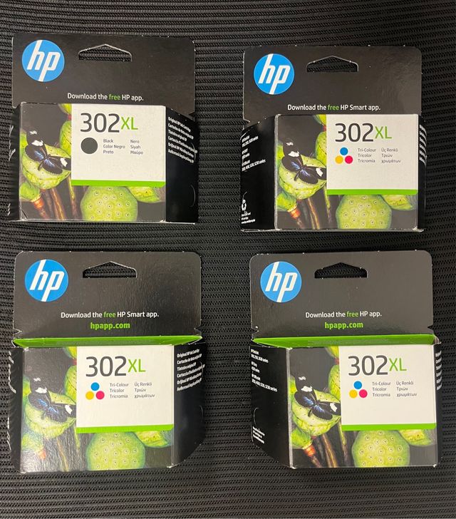 Detalles del productoPack de cuatro cartuchos de tinta HP 302XL. Incluye dos cartuchos de tinta negra y dos cartuchos tricolor.