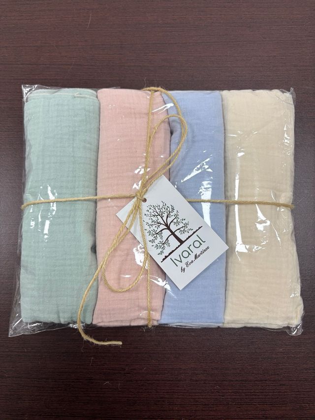 Detalles del productoConjunto de cuatro muselinas de algodón en tonos pastel, perfectas para el bebé.