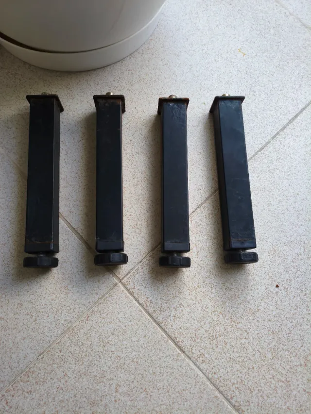 Conjunto de cuatro patas negras con base ajustable. - Material: Metal. - Color: Negro. - Cantidad: 4 unidades. - Tipo: Ajustables.