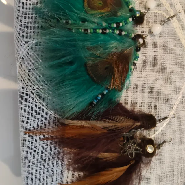 Conjunto de cuatro pendientes adornados con plumas. Cada pendiente es único y aporta un toque bohemio.