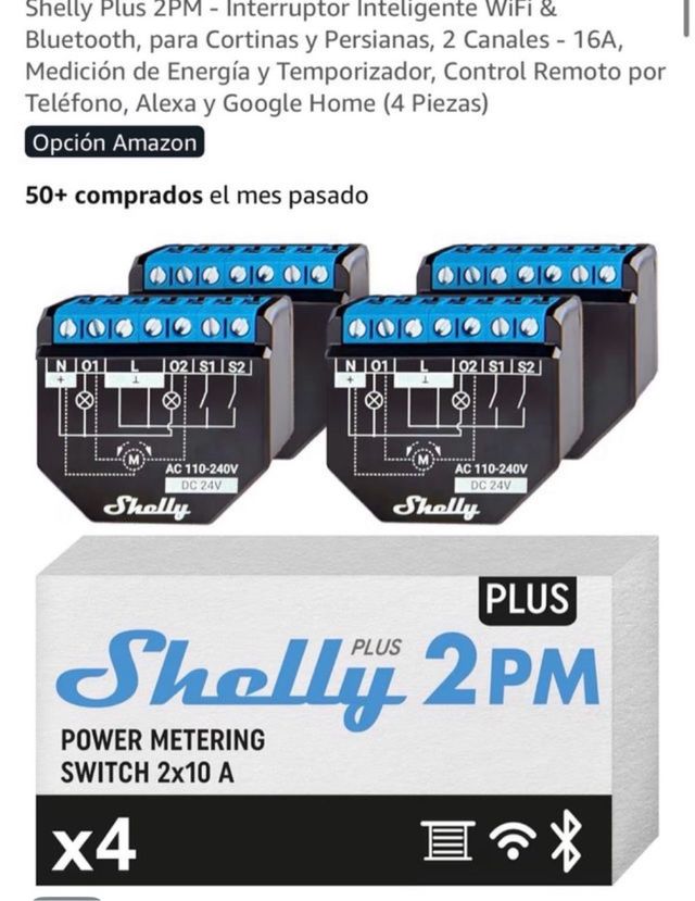 Pack de 4 interruptores inteligentes Shelly Plus 2PM. Permiten controlar cortinas, persianas y más.