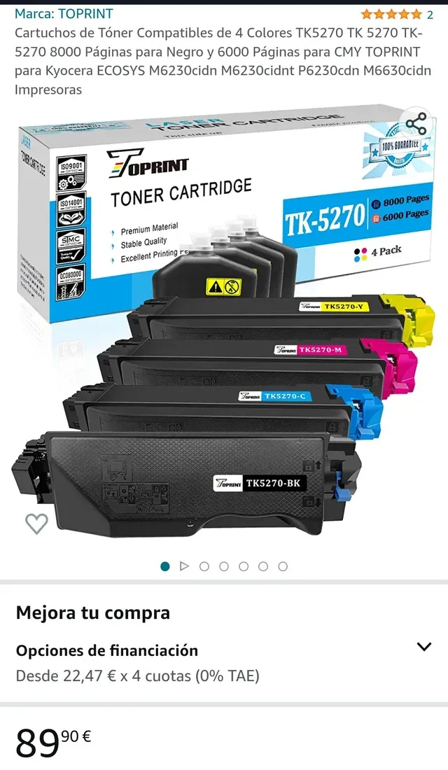Detalles del productoPack 4 Cartuchos de Tóner Compatibles (no originales) con chips de 4 Colores (negro, cian, magenta y amarillo) TK5270 TK 5270 TK-5270