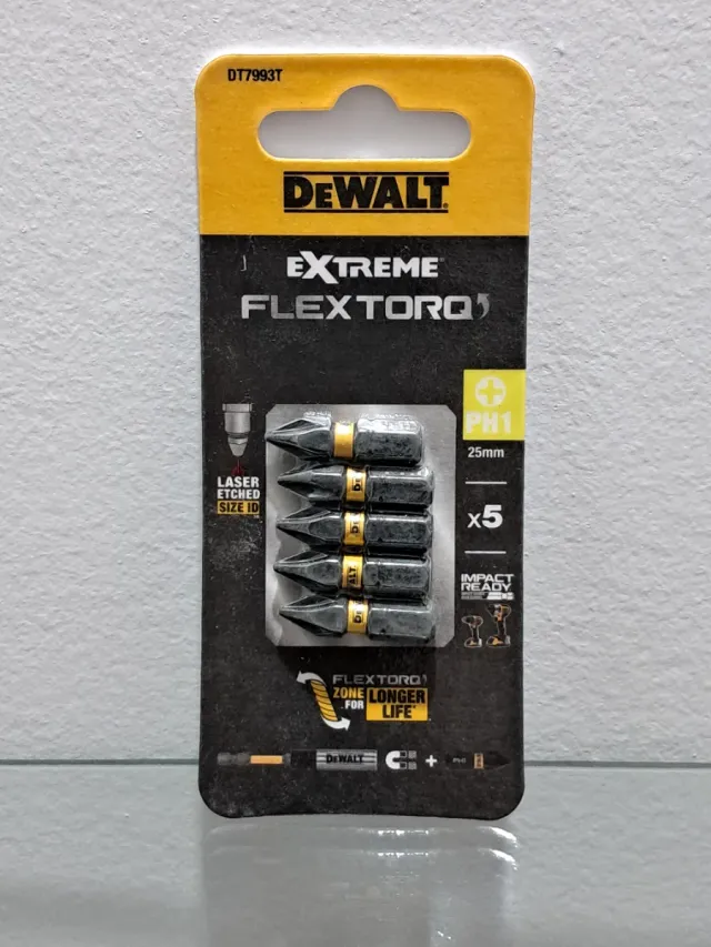 Pack de 5 puntas DeWalt Extreme FlexTorq. - Modelo: DT7993T - Tipo: PH1 - Longitud: 25mm - Tecnología: FlexTorq Zone - Compatibles con impacto (Impact Ready)