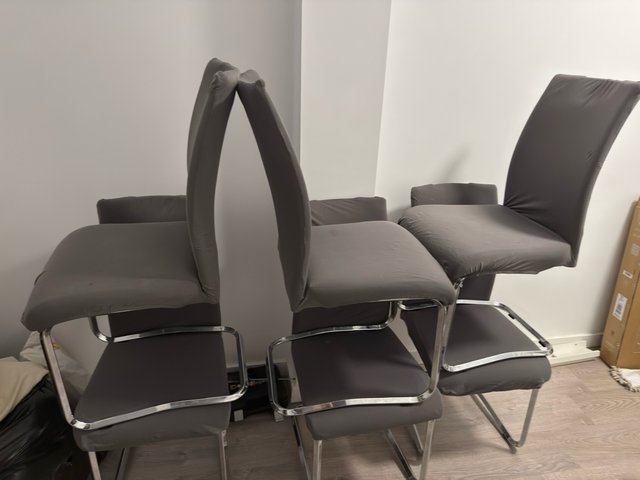 Conjunto de seis sillas elegantes, listas para ser tapizadas a tu gusto. Su diseño moderno se adapta a cualquier espacio.