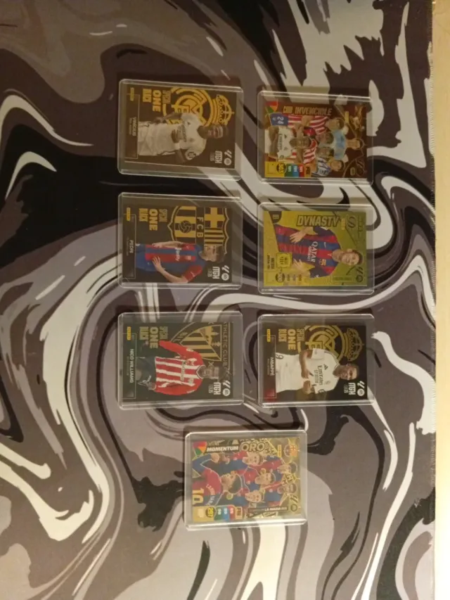 - Algunas cartas muestran escudos de equipos como el Real Madrid (RMCF) y el FC Barcelona (FCB).
