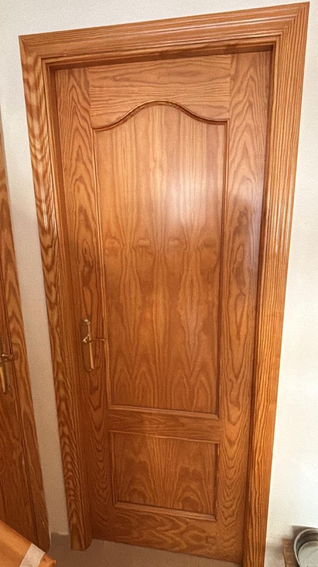 Se vende pack de 9 puertas de madera en tono claro. Una de ellas con cristales - Color: Madera clara. - Cantidad: 9 unidades.