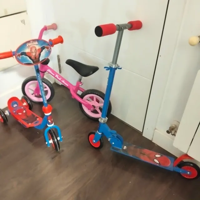 Detalles del productoLote de tres artículos infantiles para aprender a montar y desplazarse. Incluye una bicicleta de aprendizaje y dos patinetes.