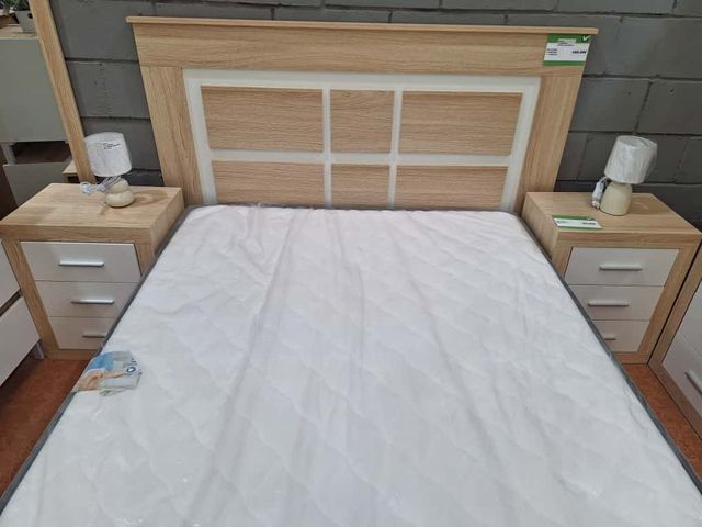 Detalles del productoConjunto de dormitorio que incluye canapé, cabecero y dos mesitas de noche.