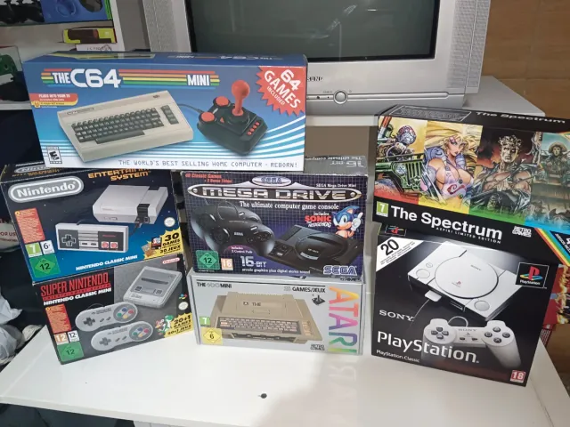 En su caja · Atari y Commodore y Nintendo y Sega y Sony · Mega Drive Mini y NES Classic Mini y PlayStation Classic y SNES Classic Mini y The · Beige