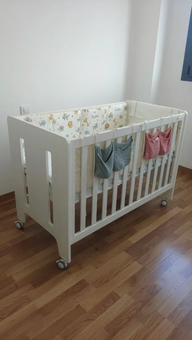 Es también cuna colecho y convertible en escritorio para cuando el bebé crezca. Tiene ruedas con frenos y un solo defecto estético minúsculo en la madera que se ve en una de las fotos. Está a precio de ganga para lo que nos costó. A recoger en Getafe. Se entrega desmontada.