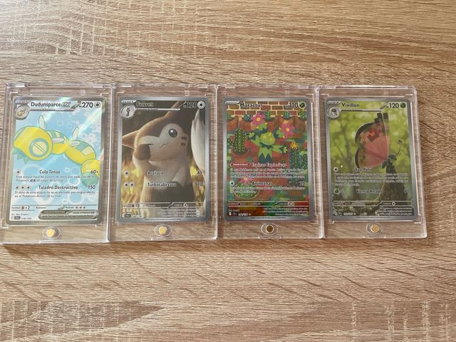Detalles del productoSe venden cuatro cartas Pokémon en perfecto estado. Están protegidas en fundas y se entregan en Toploader.