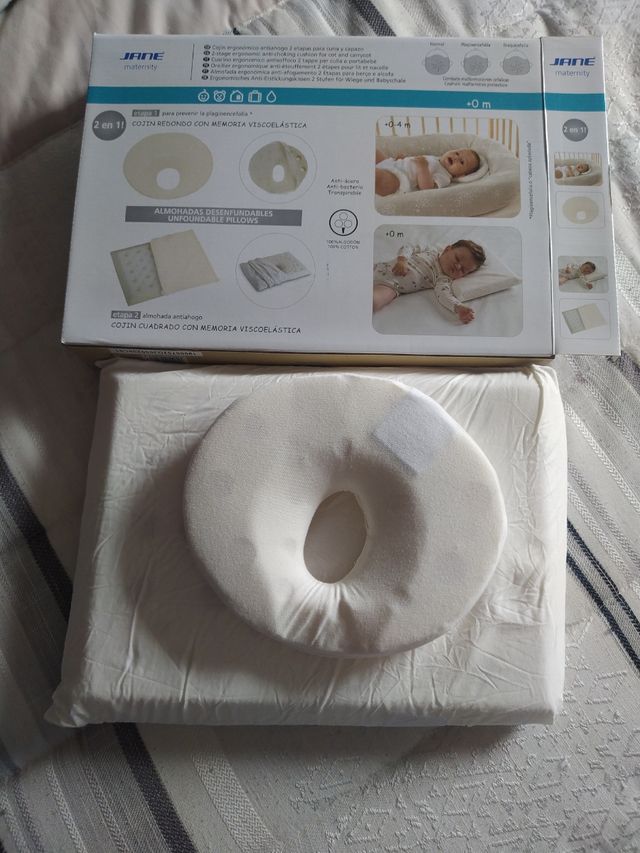Detalles del productoCojínes con memoria viscoelástica, para bebé, ambos con fundas lavables de algodón, antiácaros, antiahogo, transpirables, 2 etapas aptos desde el nacimiento. Tanto para capazo como cuna. Marca Jane. Con caja e instrucciones. Están totalmente nuevos.