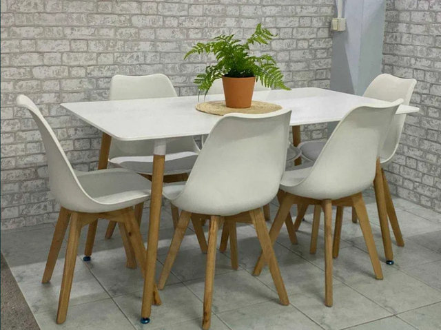 Detalles del productoConjunto de mesa blanca con cuatro sillas a juego. Ideal para comedor o cocina.
